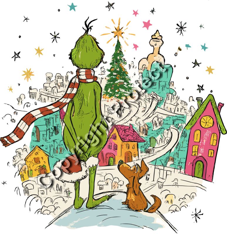 Celebrate the heartwarming magic of the holidays with How the Grinch Found His Cheer—a vibrant, storybook-style Christmas design inspired by one of the most beloved holiday classics of all time. This beautifully illustrated print captures the Grinch and his loyal dog Max as they overlook Whoville, watching the town sparkle with joy and lights on Christmas morning. The hand-drawn, sketch-style details and bright, whimsical colors make this design feel nostalgic yet modern, perfect for any Christmas lover’s collection. This cozy and colorful DTF transfer is ideal for those who love festive storytelling, cozy winter nights, and the deeper message of finding kindness and joy during the holidays. Whether you’re creating a cheerful holiday sweatshirt, a cozy Christmas tee, or a gift for your favorite Grinch fan, this print captures the warmth and wonder of the season. Perfect for: • Holiday movie lovers and nostalgic Christmas fans • Whimsical winter apparel collections • Family matching Christmas shirts or cozy loungewear • Boutique holiday drops and seasonal merch